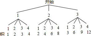 分析:首先根据题意画出树状图,然后由树状图求得所有等可能的结果与指针分别指向的两个数字的积为偶数的情况,再利用概率公式求解即可求得答案.