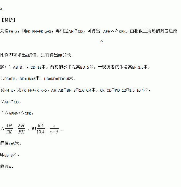 A 【解析】 先设FH=x,则FK=FH+FK=x+5,再根据AH∥CD,可得出△AFH∽△CFK,由相似三角形的对应边成比例即可求出x的值,进而得出EB的长. 【解析】 ∵AB=8米,CD=12米,两树的水平距离BD=5米,一观测者的眼睛高EF=1.6米, ∴EB=FH,BD=HK=5米,HB=KD=EF=1.6米, 设FH=x,则FK=FH+FK=x+5,AH=...