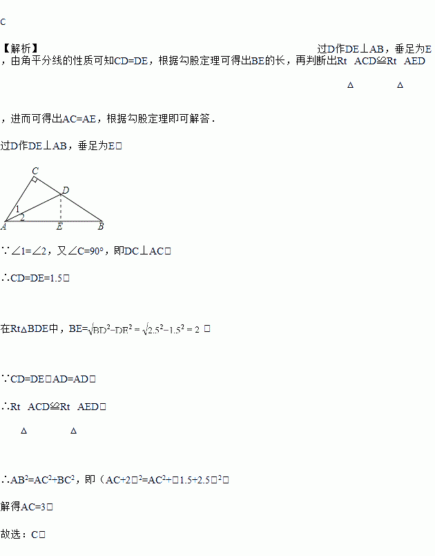 如图,在△ABC中,∠C=90°,∠1=∠2,CD=1.5,BD=2.5,则AC的长为( )