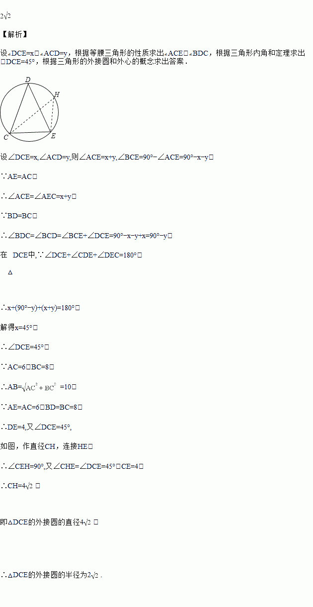 如图,在中,,,,为斜边上的两个点,且,,则的外接圆的半径是________.