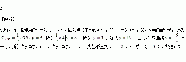 在平面直角坐标系xOy中,A为双曲线上一点,点B的坐标为(4,0).若△AOB的面积为6,则点A的坐标为
