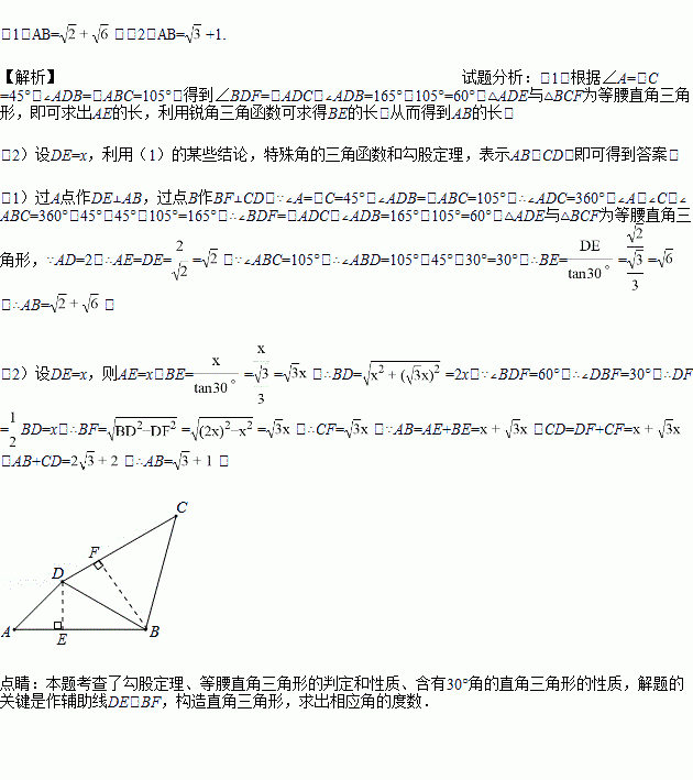 (2)若AB+CD=2+2,求AB.