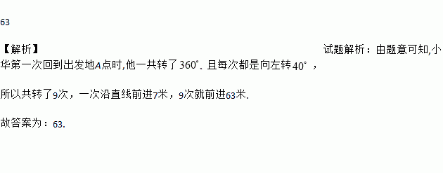 如图,小华从点A出发,沿直线前进7m后向左转40°,再沿直线前进7m后,又向左转40°……照这样走下去,小华第一次回到出发点A,共走了_________m.