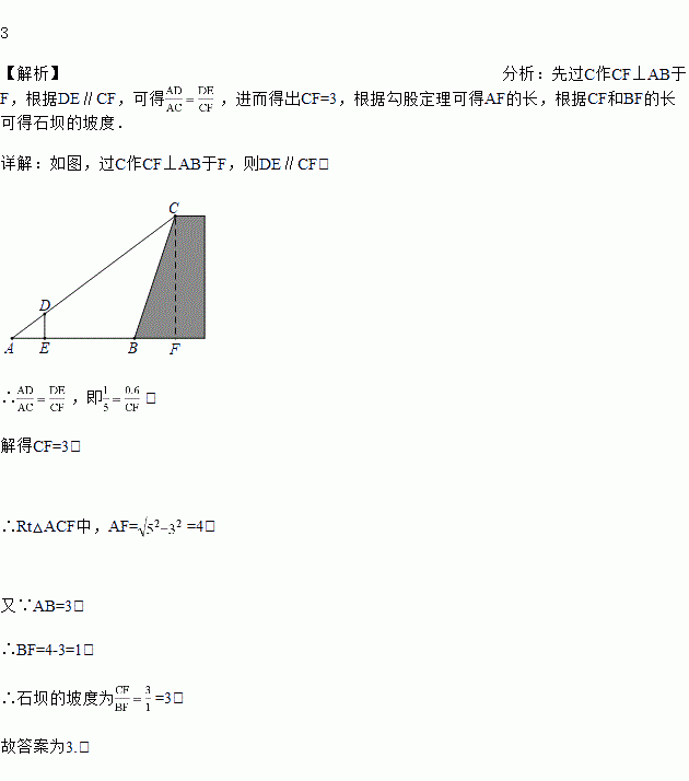 如图,为了测量山坡护坡石坝的坡度(坡面的铅直高度与水平宽度的比称为坡度),把一根长5米的竹竿AC斜靠在石坝旁,量出杆长1米处的D点离地面的高度DE=0.6米,又量得杆底与坝脚的距离AB=3米,则石坝的坡度为 _____________.