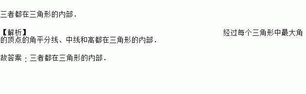 任意画一个锐角三角形、一个直角三角形、一个钝角三角形,然后画出经过每个三角形中最大角的顶点的角平分线、中线和高.观察这三个图形,说出所画的角平分 线、中线和高在三角形的内部还是外部.