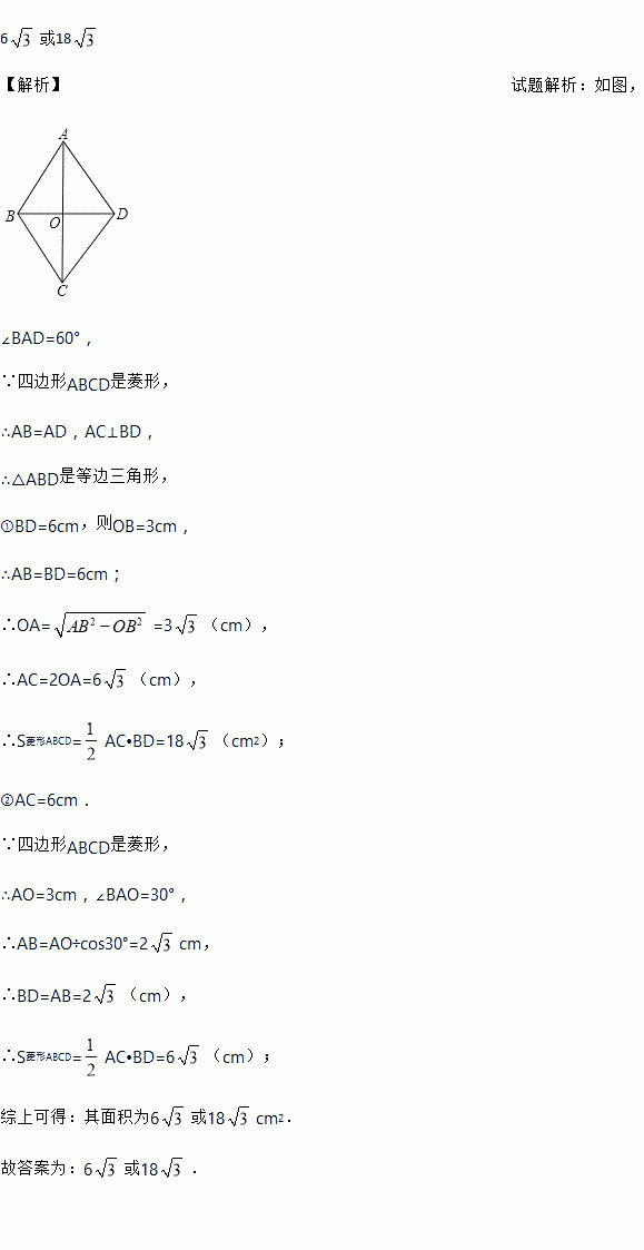 已知菱形有一个锐角为60°,一条对角线长为6cm,则其面积为_______cm2.