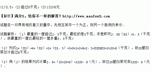 (2)与标准重量比较,20筐白菜总计超过或不足多少千克?