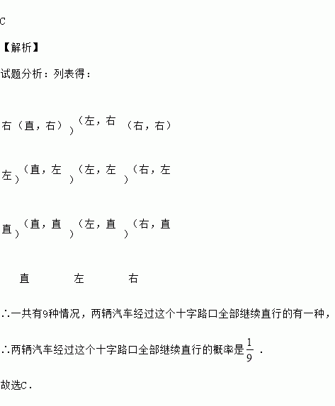 经过某十字路口的汽车,它可能继续直行,也可能向左或向右转.若这三种可能性大小相同,则两辆汽车经过该十字路口全部继续直行的概率为( )