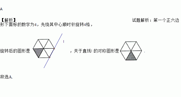 一个数学游戏,正六边形被平均分为6格(其中1格涂有阴影),规则如下:若第一个正六边形下面标的数字为a(a为正整数),则先绕正六边形的中心顺时针旋转a格;再沿某条边所在的直线l翻折,得到第二个图形。例如:若第一个正六边形下面标的数字为2,如图,则先绕其中心顺时针旋转2格;再沿直线l翻折,得到第二个图形。若第一个正六边形下面标的数字为4,如图,按照游戏规则,得到第二个图形应是( )![]()