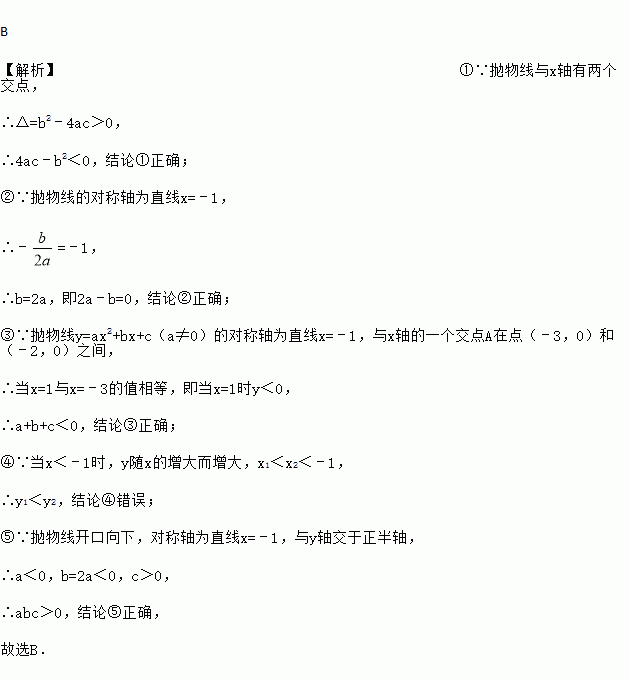 抛物线y=ax2+bx+c(a≠0)的对称轴为直线x=﹣1,与x轴的一个交点A在点(﹣3,0)和(﹣2,0)之间,其部分图象如图,则下列结论:①4ac﹣b2<0;②2a﹣b=0;③a+b+c<0;④点M(x1,y1)、N(x2,y2)在抛物线上,若x1<x2<﹣1,则y1>y2,⑤abc>0.其中正确结论的个数是( )