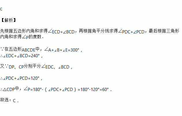 如图,在五边形ABCDE中,∠A+∠B+∠E=300°,DP、CP分别平分∠EDC、∠BCD,则∠P的度数是( )