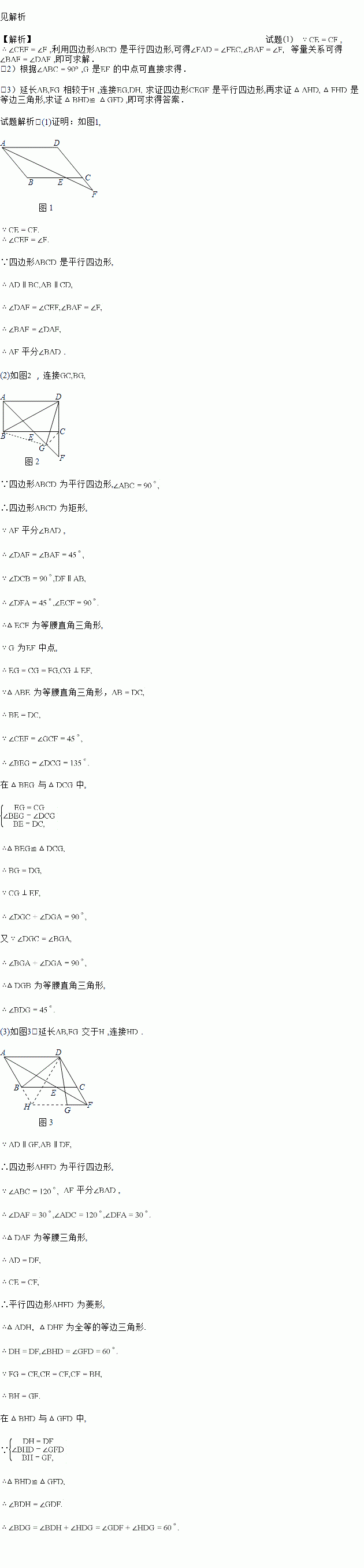 (3)如图?,在(1)的条件下,若∠BAD=60°,且FG∥CE,FG=CE,连接DB、DG,求出∠BDG的度数.