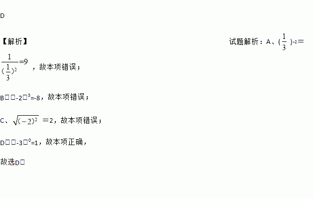 A. ()﹣2=﹣9 B. (﹣2)3=﹣6 C. =﹣2 D. (﹣3)0=1