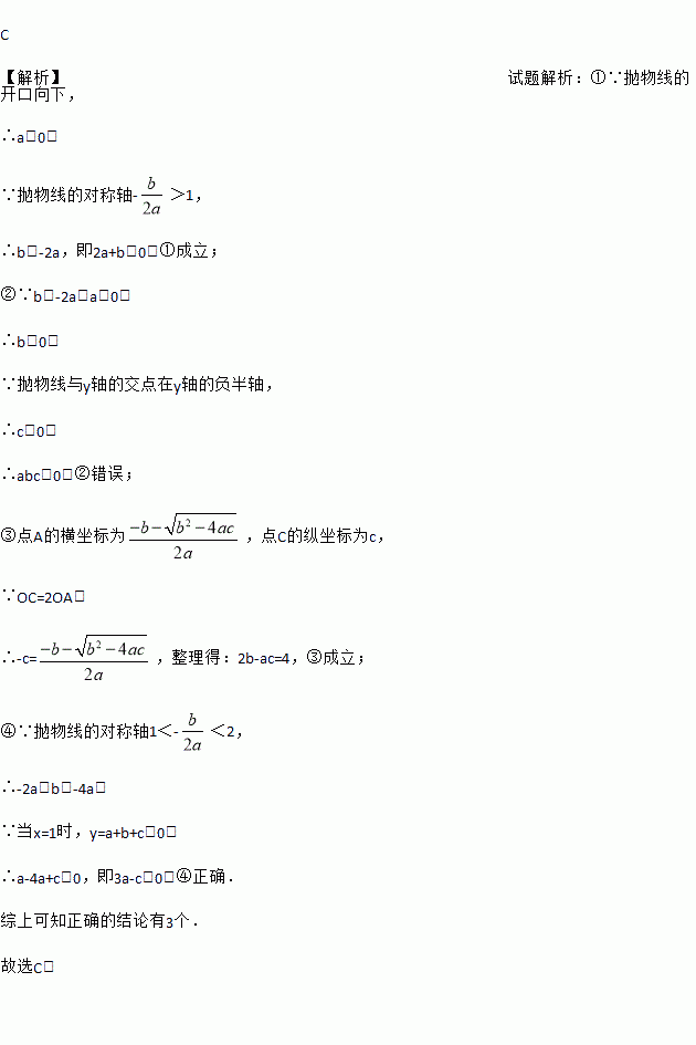 C 【解析】试题解析:①∵抛物线的开口向下, ∴a<0. ∵抛物线的对称轴->1, ∴b>-2a,即2a+b>0,①成立; ②∵b>-2a,a<0, ∴b>0, ∵抛物线与y轴的交点在y轴的负半轴, ∴c<0, ∴abc>0,②错误; ③点A的横坐标为,点C的纵坐标为c, ∵OC=2OA, ∴-c=,整理得:2b-ac=4,③...