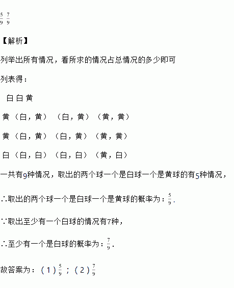 个黄球.现从这两个盒中随机各取出一个球,则取出的两个球一个是白球一个是黄球的概率为________;至少有一个是白球的概率为________.![]()