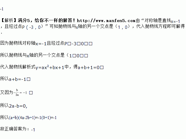如图,抛物线y=ax2+bx+1(a≠0)经过点A(-3,0),对称轴为直线x= -1,则(a+b)(4a-2b+1)的值为____________.