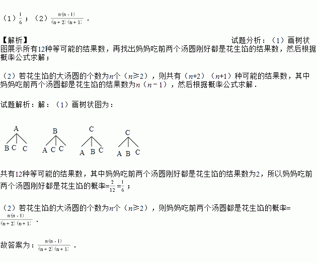 (2)若花生馅的大汤圆的个数为n个(n≥2),则妈妈吃前两个汤圆都是花生馅的概率是 (请用含n的式子直接写出结果)