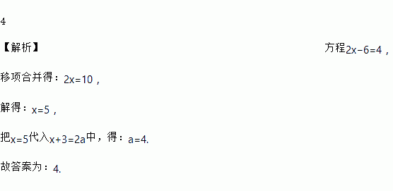 4 【解析】方程2x?6=4, 移项合并得:2x=10, 解得:x=5, 把x=5代入x+3=2a中,得:a=4. 故答案为:4.