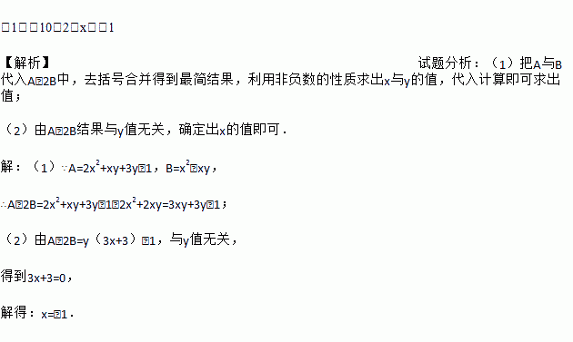 (1)-10(2)x=-1 【解析】试题分析:(1)把A与B代入A﹣2B中,去括号合并得到最简结果,利用非负数的性质求出x与y的值,代入计算即可求出值; (2)由A﹣2B结果与y值无关,确定出x的值即可. 【解析】 (1)∵A=2x2+xy+3y﹣1,B=x2﹣xy, ∴A﹣2B=2x2+xy+3y﹣1﹣2x2+2xy=3xy+3y﹣1; (2)由A﹣2B=y(3x...