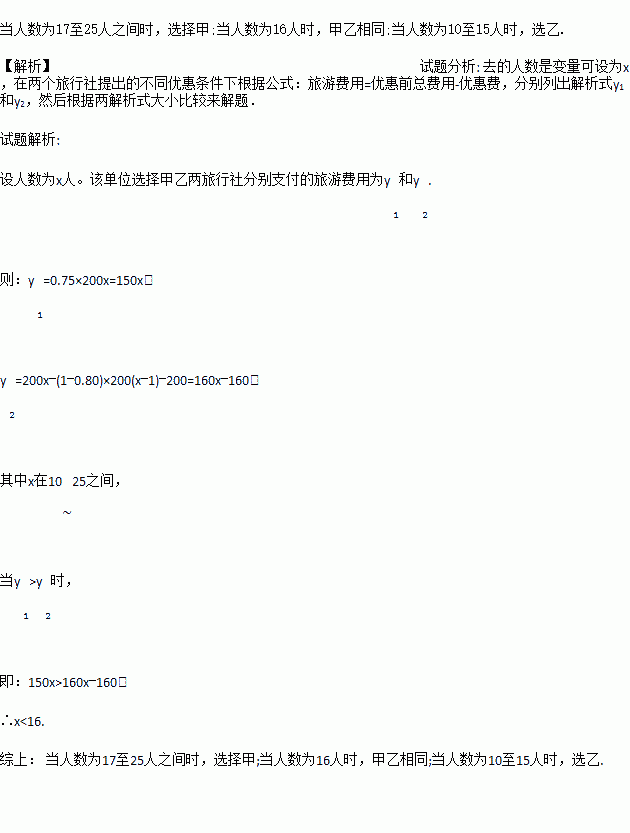 某单位计划组织部分员工到外地旅游,人数估计在10~25人之间.甲、乙两家旅行社的服务质量相同,且价格都是每人200元,但甲旅行社表示可给每位旅客七五折优惠,乙旅行社表示可先免去一位旅客的旅游费用,其余旅客八折优惠。问该单位应怎样选择,使其支付的旅游费用较少?