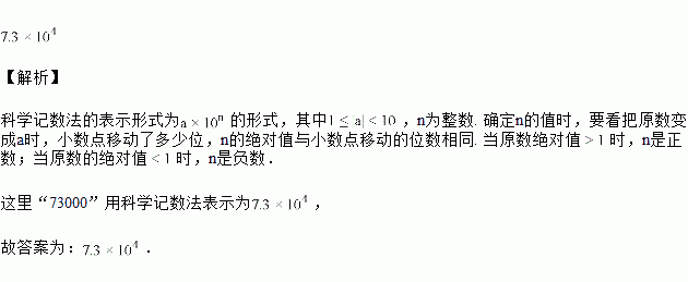 2017年9月28日,我国自行研制的大型客机“C919”在上海浦东机场完成试飞任务,该大型客机的最大起飞重量约73t,合73000kg,这里“73000”用科学记数法表示为______.