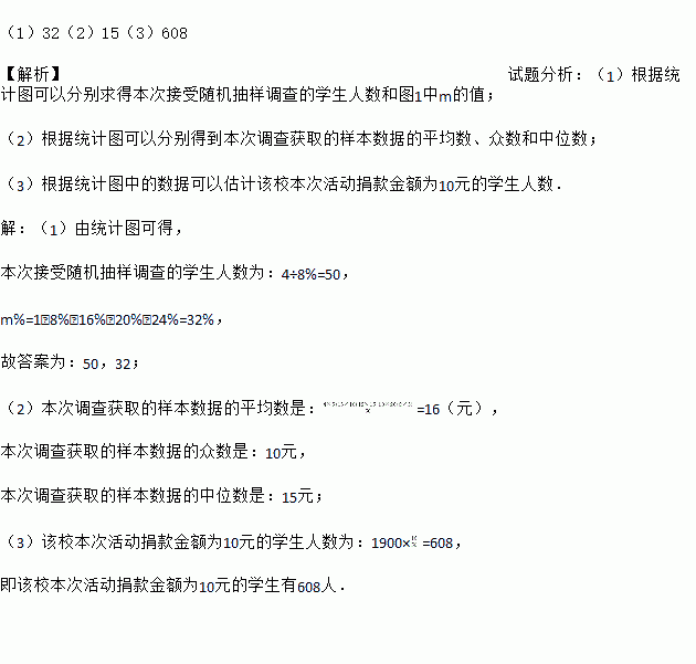 四川雅安发生地震后,某校学生会向全校1900名学生发起了“心系雅安”捐款活动,为了解捐款情况,学生会随机调查了部分学生的捐款金额,并用得到的数据绘制了如下统计图①和图②,请根据相关信息,解答下列是问题: