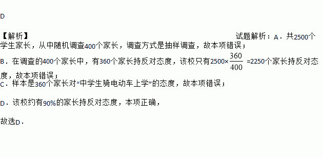 中学生骑电动车上学给交通安全带来隐患,为了解某中学2 500个学生家长对“中学生骑电动车上学”的态度,从中随机调查400个家长,结果有360个家长持反对态度,则下列说法正确的是( )