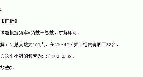 某单位有职工100名,按他们的年龄分成8组,在40~42(岁)组内有职工32名,那么这个小组的频率是( )