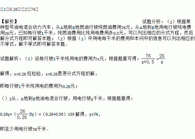(2016宁夏)某种型号油电混合动力汽车,从A地到B地燃油行驶纯燃油费用76元,从A地到B地用电行驶纯电费用26元,已知每行驶1千米,纯燃油费用比纯用电费用多0.5元.