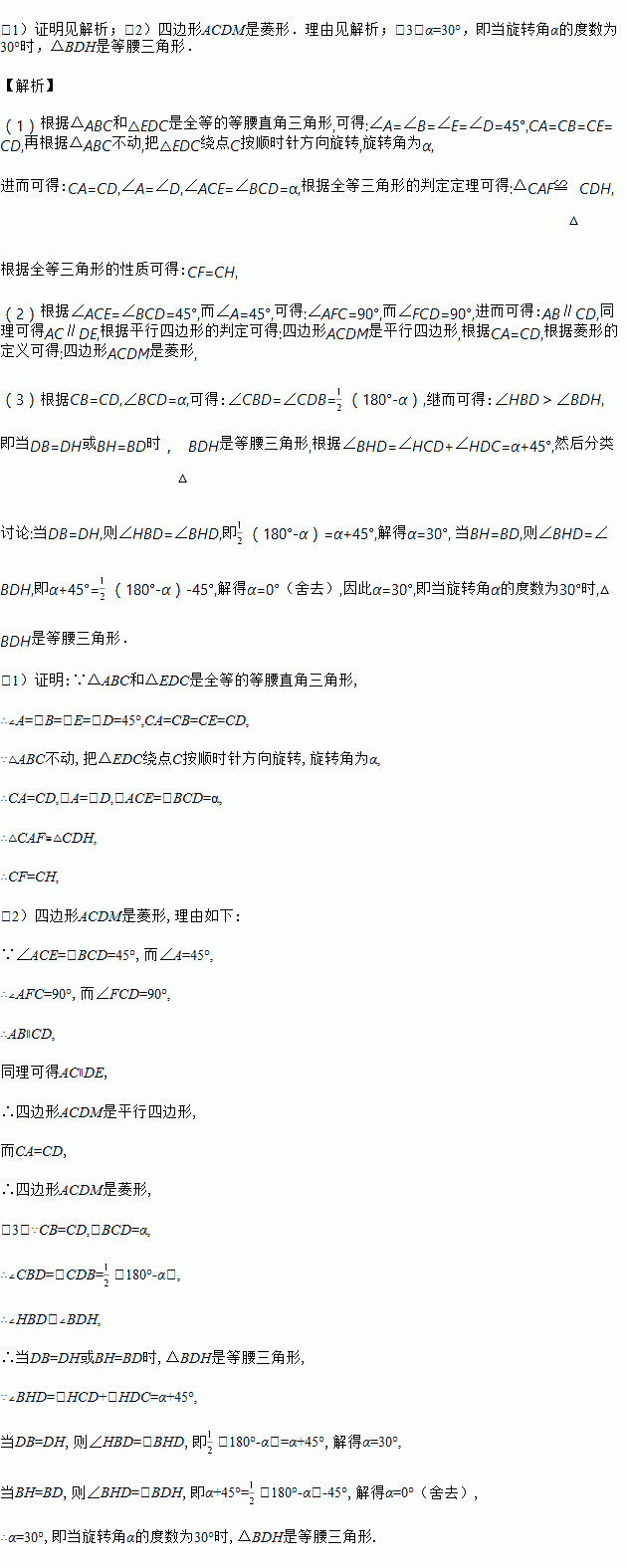(3)Èçͼ¢Ú£¬ÔÚ¡÷EDCÈÆµãCÐýתµÄ¹ý³ÌÖУ¬Á¬½áBD£¬µ±Ðýת½Ç¦ÁµÄ¶ÈÊýΪ¶àÉÙʱ£¬¡÷BDHÊǵÈÑüÈý½ÇÐΣ¿