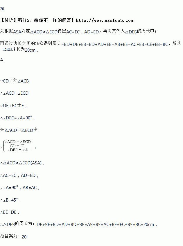 如图,已知在△ABC中,∠A=90°,AB=AC,CD平分∠ACB,DE⊥BC于E,若BC=20cm,则△DEB的周长为___cm.