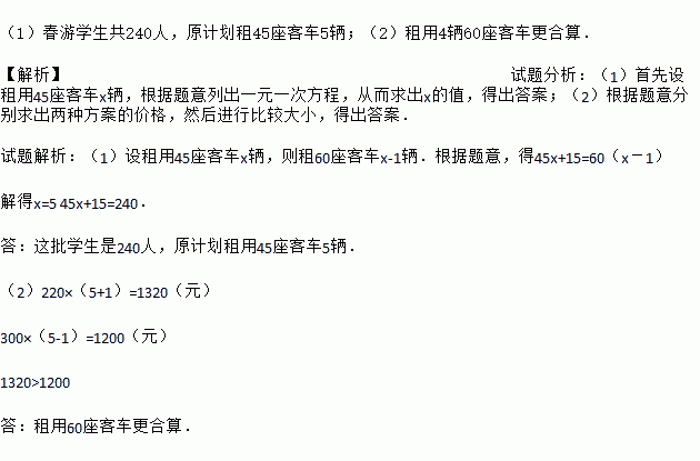 ijÖÐѧ×é֯ѧÉú´ºÓΣ¬Ô¼Æ»®×âÓÃ45×ù¿Í³µÈô¸ÉÁ¾£¬µ«ÓÐ15ÈËûÓÐ×ùλ£»Èô×âÓÃͬÑùÊýÁ¿µÄ60×ù¿Í³µ£¬Ôò¶à³öÒ»Á¾³µ£¬ÇÒÆäÓà¿Í³µÇ¡ºÃ×øÂú£¬ÒÑÖª45×ù¿Í³µÃ¿ÈÕÿÁ¾×â½ðΪ220Ôª£¬60×ù¿Í³µÃ¿ÈÕÿÁ¾×â½ðΪ300Ôª£®ÊÔÎÊ£º