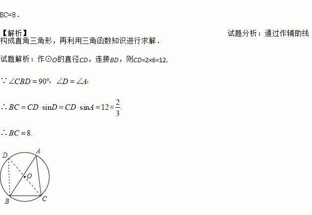 如图,锐角△ABC内接于⊙O,若⊙O的半径为6,sinA=