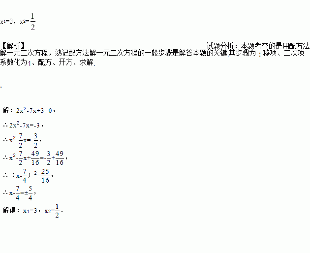 用配方法解方程:2x2﹣7x+3=0.