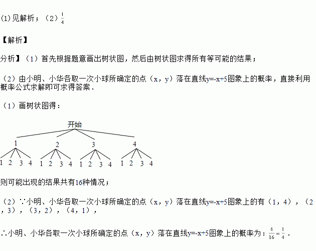 (2)求小强、小华各取一次小球所确定的点(x,y)落在一次函数图象上的概率;![]()