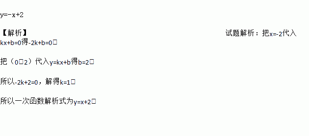 已知关于x的一元一次方程kx+b=0的解是x=-2,一次函数y=kx+b的图象与y轴交于点(0,2),则这个一次函数的表达式是________.