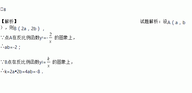 如图,已知点A,B分别在反比例函数y1=-和y2=的图象上,若点A是线段OB的中点,则k的值为________.