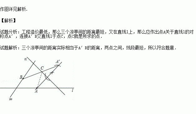 如图,某住宅小区拟在休闲场地的三条道路m,n,l上修建三个凉亭A、B、C且凉亭与长廊两两连通.如果凉亭A、B的位置己经选定,那么凉亭C建在道路l上的什么位置,才能使工程造价最低?请用尺规作出图形(不写作法,但保留作图痕迹).