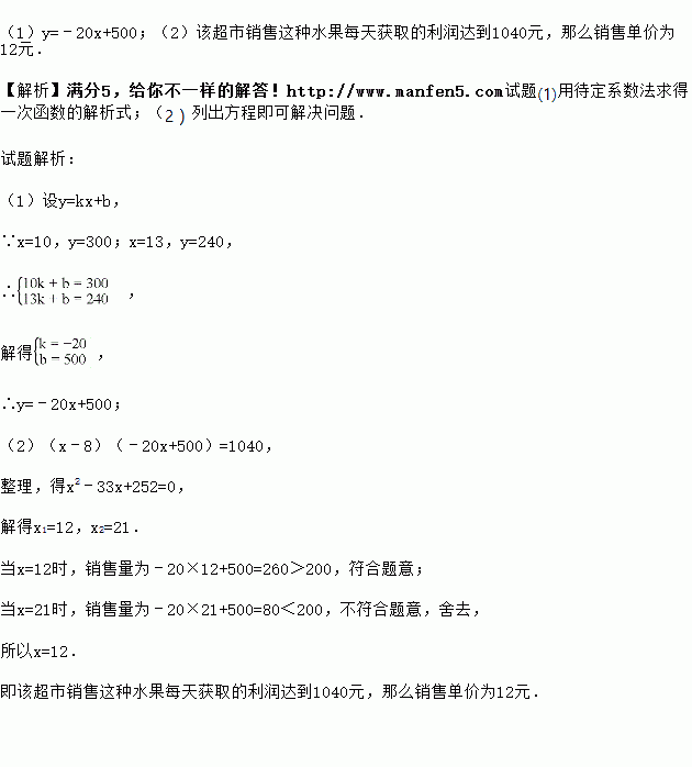 (2)该超市销售这种水果每天获取的利润达到1040元,那么销售单价为多少元?