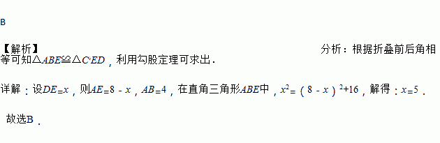 如图,已知矩形ABCD沿着直线BD折叠,使点C落在C′处,BC′’交AD于E,AD=8,AB=4,则DE的长为( )