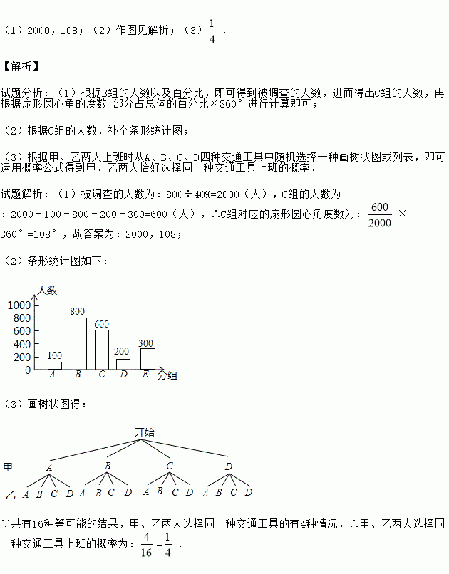 (1)2000,108;(2)作图见解析;(3). 【解析】 试题分析:(1)根据B组的人数以及百分比,即可得到被调查的人数,进而得出C组的人数,再根据扇形圆心角的度数=部分占总体的百分比×360°进行计算即可; (2)根据C组的人数,补全条形统计图; (3)根据甲、乙两人上班时从A、B、C、D四种交通工具中随机选择一种画树状图或列表,即可运用概率公式得到甲、乙两人恰好选择...
