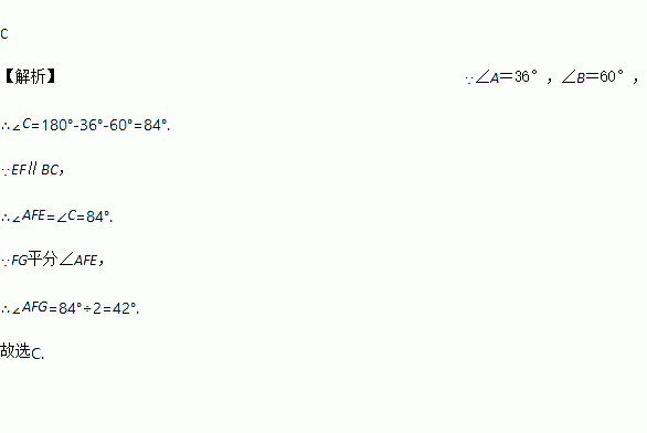 如图,△ABC中,∠A=36°,∠B=60°,EF∥BC,FG平分∠AFE,则AFG的度数为( )