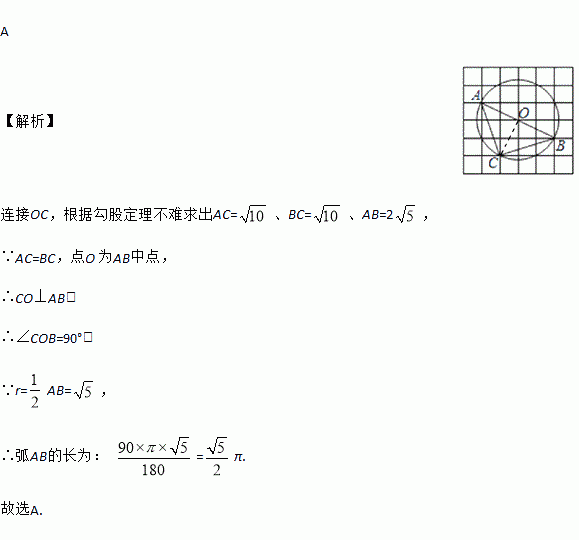 如图,在6×6的方格纸中,每个小方格都是边长为1的正方形,其中A、B、C为格点.作△ABC的外接圆⊙O,则弧的长为( )