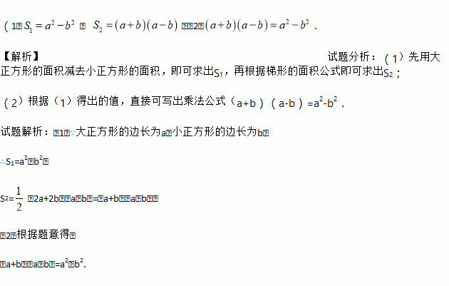 (1)设图1中阴影部分面积为S1,图2中阴影部分面积为S2,请直接用含a、b的式子表示S1和S2;