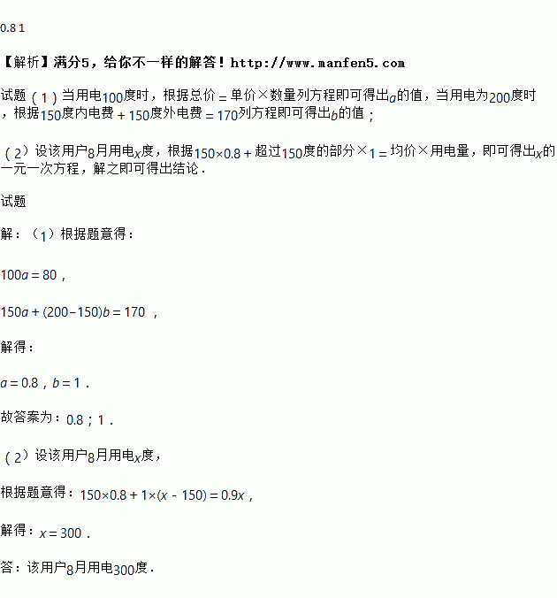 2017年5月份,该市居民甲用电100度,交电费80元;居民乙用电200度,交电费170元.