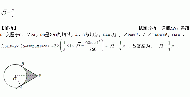 如图,P 为⊙O 外一点,PA、PB 是⊙O 的切线,A、B 为切点,已知PA=,∠P=60°,则图中阴影部分的面积为 .