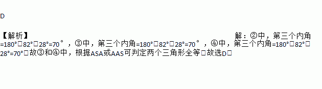 D 【解析】【解析】 ②中,第三个内角=180°-82°-28°=70°,③中,第三个内角=180°-82°-28°=70°,④中,第三个内角=180°-82°-28°=70°.故③和④中,根据ASA或AAS可判定两个三角形全等.故选D.