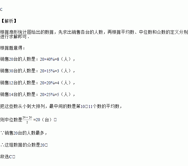 某电脑公司销售部为了定制下个月的销售计划,对20位销售人员本月的销售量(单位:台)进行了统计,绘制成如图所示的统计图,则这20位销售人员本月销售量的中位数、众数分别是( )