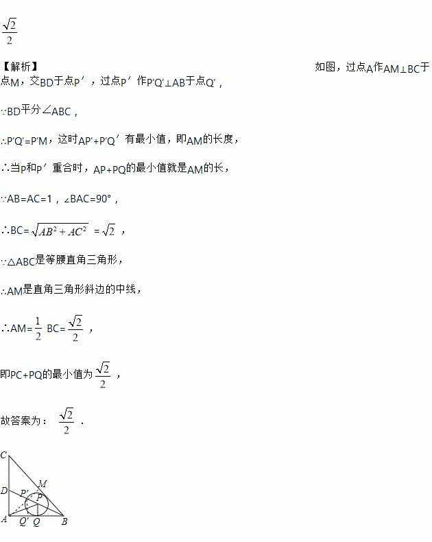 如图,在等腰三角形ABC中,∠BAC=90°,AB=AC=1,BD平方∠ABC,点P在BD上,⊙P切AB于点Q,则AP+PQ的最小值等于________.