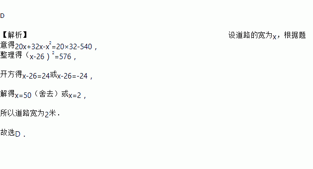 如图,在宽为20米、长为32米的矩形地面上修筑同样宽的道路图中阴影部分,余下部分种植草坪要使草坪的面积为540平方米,则道路的宽为